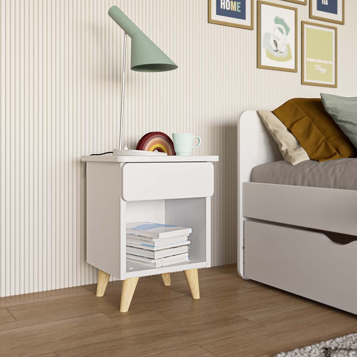 Le chevet Lilow séduit par son design élégant et ses lignes épurées. Sa silhouette minimaliste lui permet de s'intégrer harmonieusement dans n'importe quelle décoration de chambre. Les pieds arrondis adoucissent son apparence, créant une ambiance cocooning et chaleureuse dans la pièce. Avec son coloris neutre, ce chevet est un choix polyvalent qui convient aussi bien pour la chambre d'une petite fille que pour celle d'un garçon, permettant ainsi une décoration personnalisée en fonction de la personnalité de votre enfant.