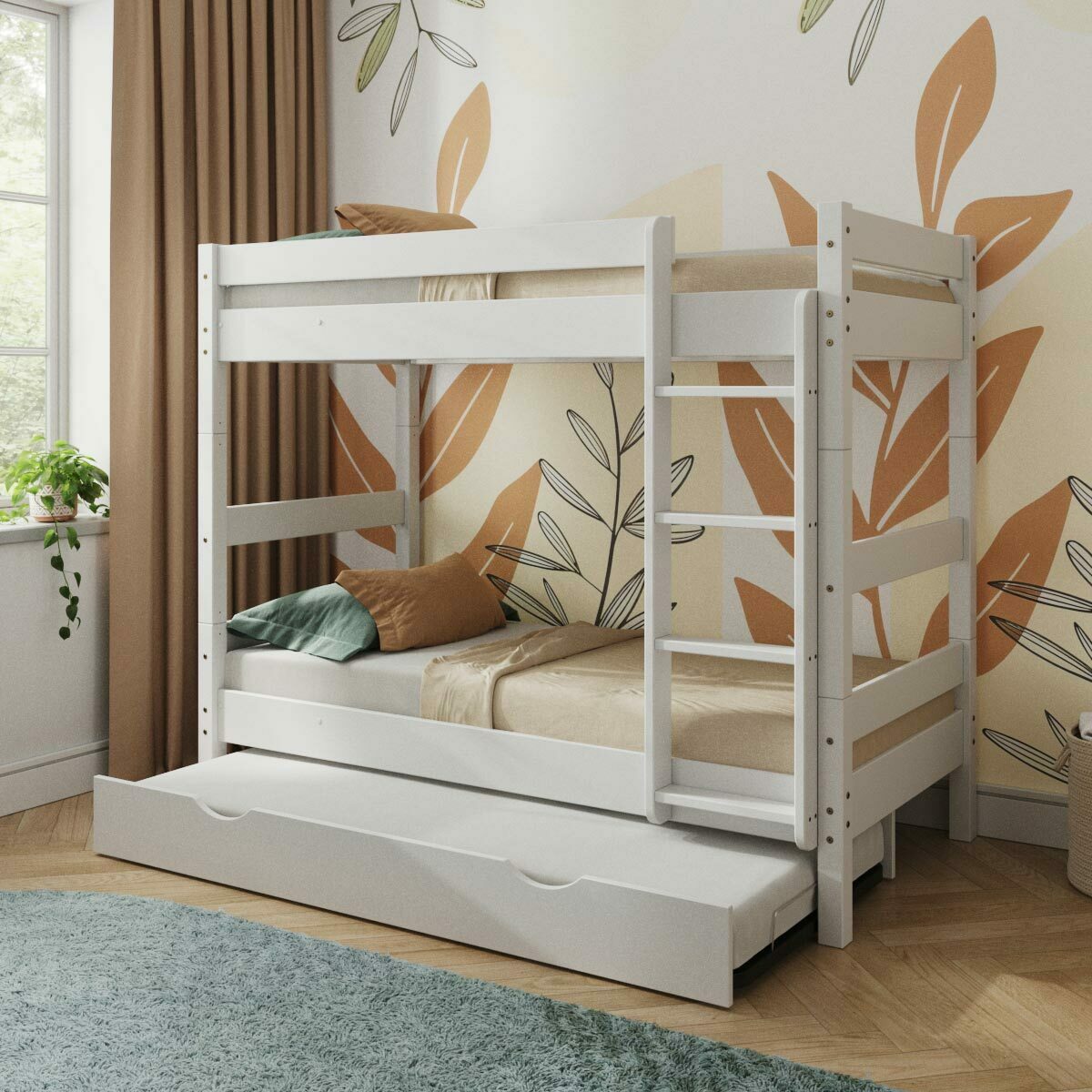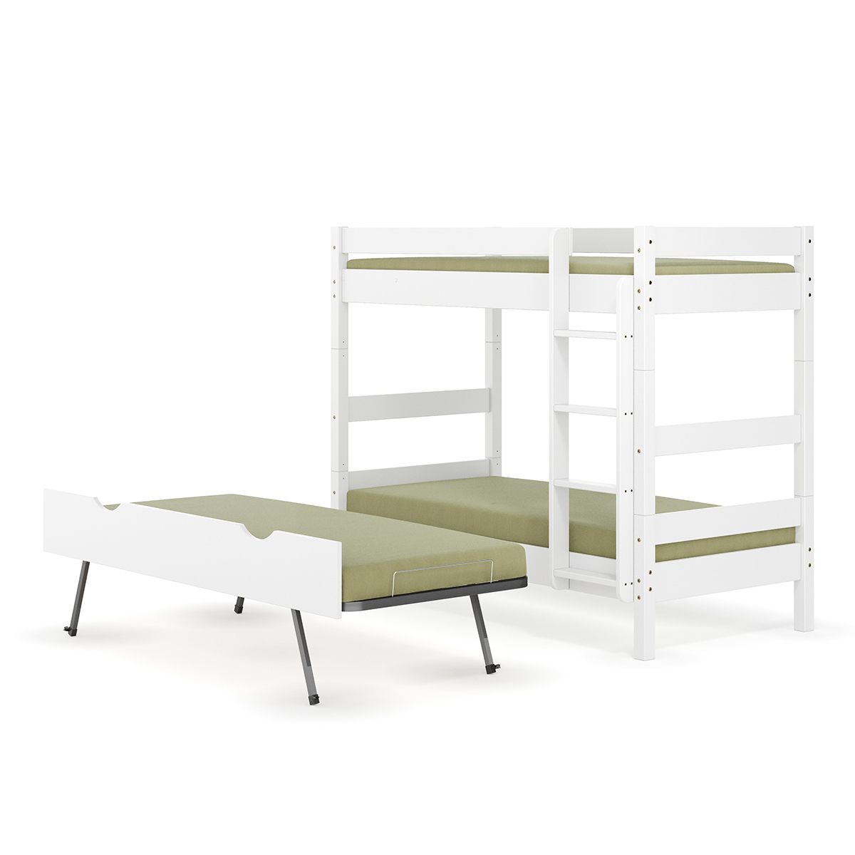 Ce lit superposé Aaron se démarque des autres modèles par ses trois couchages ultraconfortables. En effet, à part les deux lits standards offrant une bonne épaisseur, il dispose également d’un sommier gigogne de la même dimension. Ce troisième couchage est très pratique lorsqu’une proche famille ou un invité surprise vient dormir chez vous. Après son usage, le sommier se range sous le lit du bas grâce à des roulettes intégrées.